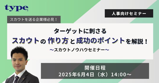 転職サイト「type」では、6月4日(水)に「ターゲットに刺さるスカウトの作り方と成功のポイントを解説」を開催いたします。