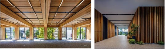 野村不動産溜池山王ビルは、旧野村不動産溜池ビルの建て替え事業として推進し、2023年10月に竣工した木質サステナブルオフィスです。清水建設株式会社(本社:東京都中央区/代表取締役社長:井上和幸)の「シミズ ハイウッド(R)」を活用し木質建築部材と鉄骨造を合理的に組合せ、高い耐震性と耐火性を確保しつつ心地よい無柱の木質オフィス空間を実現しました。この開放的な無柱空間を創出することで、ワーカーの健康と知的生産性の向上を目指しています。その他、外装は格子状の木質ファサードにより印象的な都市景観を創出し、エントランスはスギ材のルーバーを一定の規則性をもって配置し、内外に渡り植栽を配置することで、外部環境を取り込んだ親自然的な空間とする等、木質化の取組を積極的に採用したオフィス事例です。