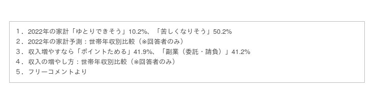 また、「もしあなた自身が本業以外で家計のために収入を増やすとしたら、どんな方法を選択しますか」との質問には、「ポイントをためる」との回答が最も多く41.9%、僅差で「副業(長期や短期の業務委託・請負契約)」が41.2%でした。昨年(※)1位だった「副業(雇用契約)」は32.9%で4位。副業に際して、業務委託や請負契約がより身近で選択しやすくなっている様子が伺えます。一方で、収入の増やし方においても世帯年収の違いで特徴が見られました。500万未満の世帯が500万以上を大きく上回ったのは「副業(雇用契約)」です。労働力をより安定的かつ確実に収入へと結びつける手段が選択される傾向があるように感じます。逆に500万以上の世帯が500万未満を大きく上回ったのは、「金融商品の売買」でした。残念ながら、家計をめぐる環境は2022年も明るいとは言えません。世帯年収によって二極化傾向が見られますが、フリーコメントには世帯年収900万以上でも家計の厳しさを訴える声が見られました。それぞれの世帯状況に応じた収入確保の選択肢や支援が必要なのだと考えます。