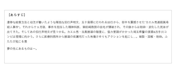 本作は、『連続殺人鬼カエル男』の7年ぶりの続編です。凄惨な殺害方法で現場には幼児が書いたような稚拙な犯行声明文を残し、無差別に五十音順に殺人を繰り返し、街中を震撼させた“カエル男連続猟奇殺人事件”の10ヵ月後を描いています。また、他の出版社の作品でも活躍するお馴染みの人物達も登場。書店員の方々より「このラストにびびらないものはいない」「第2弾にして最高傑作!これぞエンタメミステリーの到達点!!」と好評をいただいています。
