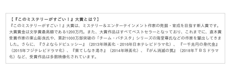 中山氏は現在、新聞をはじめ多くの媒体で連載を持つ人気の作家です。取材も可能ですのでお気軽にお問い合わせいただけますと幸いです。宝島社はこれからも、新しい作家・作品を発掘・育成し、業界の活性化に寄与していきたいと思います。