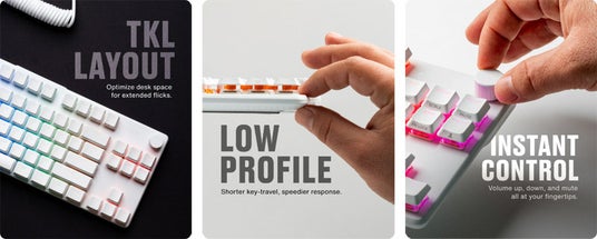 テンキーレスで小型のため、マウス操作のためのスペースを大きく確保することができます。ロープロファイル仕様のキースイッチを採用しているためリストレストがなくても入力しやすく、長時間のゲームプレイでも快適さを維持できます。