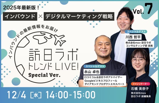 業界最大級のインバウンドビジネスメディア「訪日ラボ」及び 店舗向け集客一元化プラットフォーム「口コミコム」を運営する株式会社mov(代表取締役:渡邊 誠、本社:東京都渋谷区、以下mov)は、12月4日(水)14:00~15:00よりオンラインでセミナーを配信します。参加費は無料です。