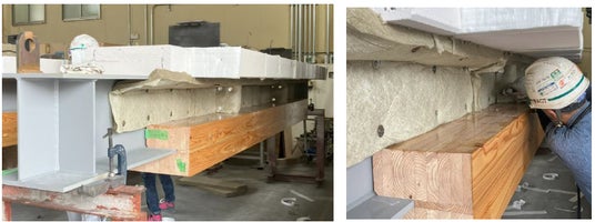 H形鋼の下端に集成材を挟み込む構成により、鉄骨の補剛と耐火被覆を併せ持つ部材。集成材が被らない範囲は、無機繊維フェルトにて被覆
