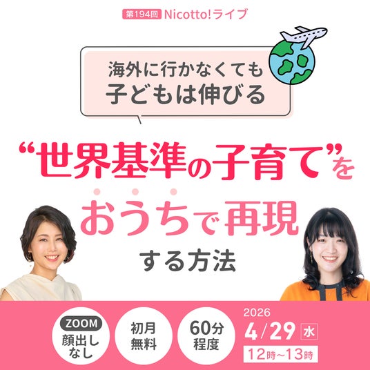 (株)パステルコミュニケーション(本社:東京都豊島区、代表取締役:吉野加容子)が運営する、発達障害・グレーゾーンの子どもを育てるママがいつでも学べて相談できるオンライン子育て塾「Nicotto!塾」は、2026年4月29日(水)お昼12時より、「海外に行かなくても子どもは伸びる 世界基準の子育てをおうちで再現する方法」をテーマにオンラインライブを開催いたします。