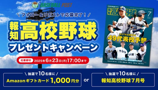 報知新聞社(代表取締役社長・長谷川剛)が運営する野球専門サイト「Baseball Post(ベースボールポスト)」は、公式Xアカウントでプレゼントキャンペーンを実施いたします。今回は、第107回全国高校野球選手権大会への切符をかけた全49地方大会を大予想、注目校、注目選手を満載した「報知高校野球」7月号(6月20日から発売)やAmazonギフトカードをプレゼントします。