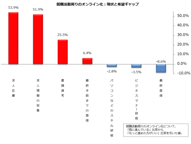 一方「就職活動周りで、もっとオンライン化を進めた方がいいと思うものはありますか」との質問には、32.6%が「パソコンなどのスキル研修」を挙げ最も多くなりました。また「最終手前までの面接」が28.5%、「最終面接」が20.5%と、書類選考後の面接においてもオンライン化を進めることを希望する人が一定数います。就職活動周りのオンライン化について「既に進んでいる」比率から「もっと進めた方がいい」比率を引いて算出したギャップ値では、「最終面接」のマイナスが最も大きくなりました。採用選考において、「最終面接」までオンライン化を進めた方がいいと考える約2割の人にとっては現状のオンライン化はまだ不十分のようです。これからテレワーク勤務がさらに浸透していけば、求人検索から最終面接、ひいてはその後の勤務と、就業周りのすべての工程がオンライン上で完結する職場がもっと身近になっていく可能性があるように思います。