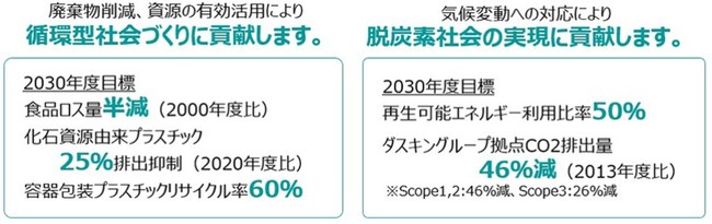 循環型社会づくりに向けて、フード事業における食品ロス量の削減目標やグループ全体で使用している化石資源由来プラスチックの削減、容器包装プラスチックのリサイクル率を向上させる目標を新たに設定しました。また、脱炭素社会の実現に向けて、2030年度までに再生可能エネルギーの利用比率目標を50%に設定するとともに、グループ拠点におけるCO2排出削減目標を2013年度比26%から46%に引き上げました。今後も、サステナブルを目指す企業として環境保全と企業経営の両立に取り組み、持続可能な社会の発展に貢献してまいります。