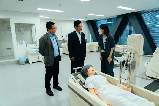 杜公使参事官らを首都医校の救急救命学科の学生が大きな拍手でお出迎え、その後各学校を見学されました。首都医校では、看護実習室・介護実習室をご覧になり、医療現場を再現した実習室や器具にも興味を持っていただきました。