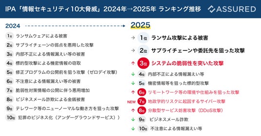 Visionalグループの株式会社アシュアード(所在地:東京都渋谷区/代表取締役社長:大森 厚志)が運営する、セキュリティ評価プラットフォーム「Assured(アシュアード)」(https://assured.jp/ 以下、Assured)は、IPA「情報セキュリティ10大脅威 2025」の解説レポートを本日公開しました。
