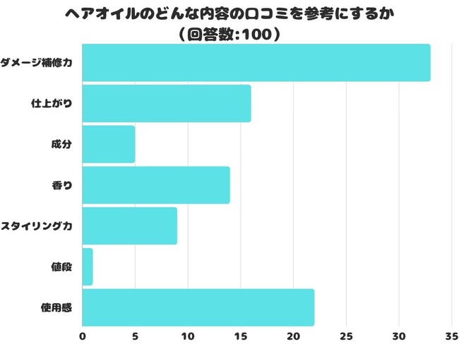 ヘアオイルのどんな内容の口コミを参考にするかをアンケートにて調査したところ、1位は「ダメージ補修力」でした。
