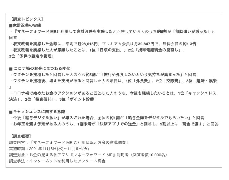 株式会社マネーフォワード(本社:東京都港区、代表取締役社長CEO: 辻庸介、以下「当社」)は、お金の見える化サービス『マネーフォワード ME』の利用者を対象に、2021年の家計状況や、コロナ禍のお金にまつわる変化、キャッシュレスに関する意識をテーマに、「お金の意識調査2021」を行いました。