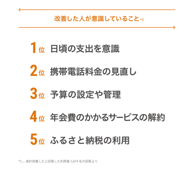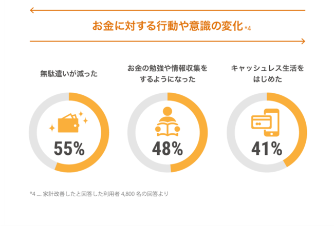 アンケート調査の結果、『マネーフォワード ME』を利用して家計改善を実感したと回答している方のうち約6割が、「無駄遣いが減った」と回答し、平均で月28,615円(年間約34万円)の収支改善を実感しているなど、昨年に引き続き大きな改善につながっていることがわかりました。