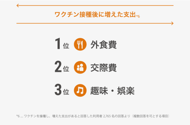 また、新型コロナウイルスのワクチン接種後の消費動向として、ワクチンを接種したと回答した人のうち、約5割が「旅行や外食したいという気持ちが高まった」と回答し、ワクチン接種後に増えた支出がある人の中で、1位「外食費」、2位「交際費」、3位が「趣味・娯楽」が支出項目に挙がりました。