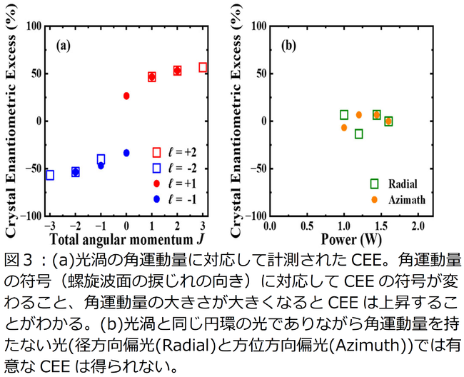 その結果、図3(a)のように、光渦の螺旋波面の方向に対応した鏡像体が過剰に成長することが明らかになりました。また、光渦の角運動量を大きくするとCEEが上昇することも明らかになりました。光渦と同じ空間強度分布を持ちながら角運動量を持たない軸対称偏光(図3(b))を光源として結晶化しても有意なCEEが見られなかったことから、光渦の軌道角運動量がアキラル結晶からキラル結晶へと転移するときに結晶構造を力学的にねじっているものと考えられます。