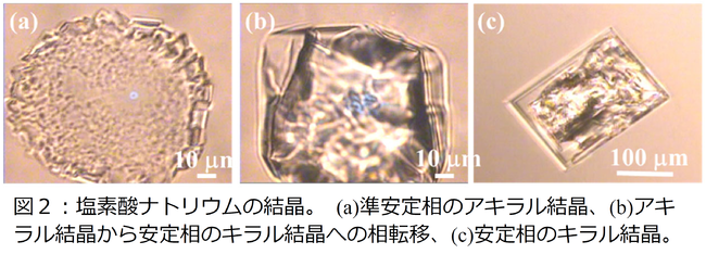 (注3)塩素酸ナトリウム:NaClO3の分子式であらわされる分子。溶液中で分子はアキラルであるが、結晶化するとキラリティーを示す。結晶には旋光性の異なるl体とd体があり、光学的に鏡像体が簡便に同定できることからキラル結晶化実験のモデル分子として知られる。