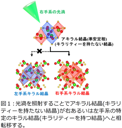 千葉大学分子キラリティー研究センター豊田耕平助教、宮本克彦准教授、尾松孝茂教授の研究チームと国立陽明交通大学Hao-Tse Su博士後期課程学生、杉山輝樹教授(千葉大学客員教授)の研究チームは、光渦(注1)をレーザートラッピング結晶化法(注2)に用いることで、塩素酸ナトリウム(注3)のキラル結晶化において、結晶のキラリティーが制御できることを世界で初めて明らかにしました(図1)。準安定相であるキラリティーを持たないアキラル結晶から安定相であるキラル結晶へと相転移する際に光渦の螺旋波面に由来するトルク(角運動量(注4))によって構造が局所的にねじれ、エナンチオ制御的にキラル結晶へと誘導することを示唆します。この結果は、アキラルな分子がキラル結晶化するメカニズムの解明に基礎的知見を与えるものであるとともに、光の螺旋性がホモキラリティー(注5)の起源に関予する可能性を示唆するものです。