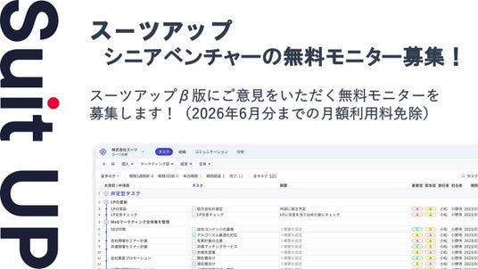 株式会社スーツ(所在地:東京都千代田区、代表取締役社長CEO:小松 裕介)は、AIでかんたん、チームのタスク管理・プロジェクト管理ツール「スーツアップ」において、シニアベンチャーの無料モニターを募集いたします。
