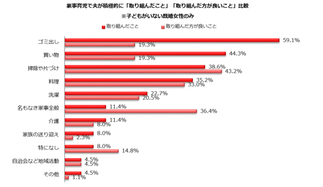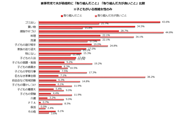 「2021年を振り返って、家事・育児で夫が“積極的に取り組んでいた”と思うことは何ですか」との質問には、お子さんがいるいないに関わらず、「ゴミ出し」が1位となりました。「2021年を振り返って、家事・育児で夫が“もっと積極的に取り組んだ方が良い”と思うことは何ですか」との問いでも、お子さんがいる妻もいない妻も同じ「掃除や片づけ」が1位となりました。家事育児で夫が積極的に「取り組んだこと」の比率から「取り組んだ方が良いこと」の比率を引いてギャップを算出したところ、「ゴミ出し」「買い物」は積極的に取り組んでいる一方、「名もなき家事」「掃除や片づけ」への取り組みに物足りなさを感じているという傾向も、お子さんがいるいないに関わらず共通しています。「名もなき家事」は、家事に積極的ではない夫にとって存在自体が見えていない可能性があります。ご夫婦の間で「名もなき家事」を含めた家事育児の全体像を共有することが、状況改善の第一歩となるのではないでしょうか。