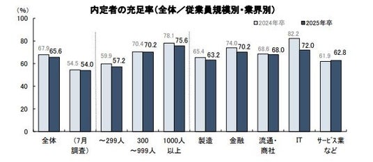 内定者充足率の平均は65.6%で、前年同期調査(67.9%)を下回った