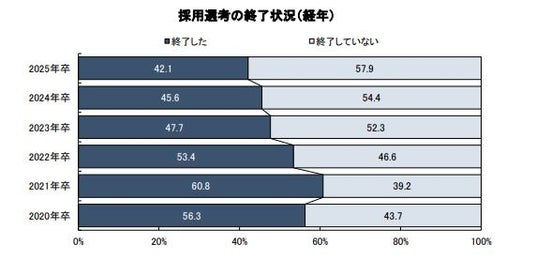採用選考を「終了した」42.1%。4年連続で低下。未終了企業の6割強は予定外に継続
