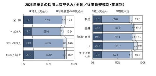 採用数「増える見込み」が18.7%で、「減る」(6.4%)を上回る。採用予算の増加が顕著