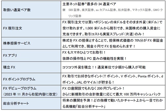 本キャンペーンでは、「スワップポイント30%増量」「最大100万円キャッシュバック」「積立FXの利用開始手続きで200円プレゼント」「はじめてのFX現引注文で米国株手数料を全額キャッシュバック」の4つの豪華な特典をご用意しています。FX(外国為替保証金取引)をすでにお取引されているお客さまも、これからFX取引をはじめようとお考えのお客さまにもご活用いただけるものと期待しています。