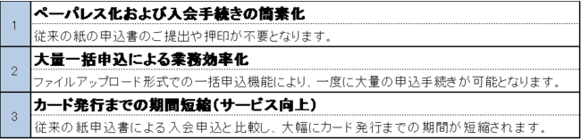 株式会社ジェーシービー (本社:東京都港区、代表取締役会長兼執行役員社長:浜川 一郎、以下:JCB)は、2022年10月17日より大企業向けのコーポレートカード・パーチェシングカードおよびETCカードの入会申込をWEB上で行う、「JCB法人使用者WEB入会サービス」の提供を開始いたします。