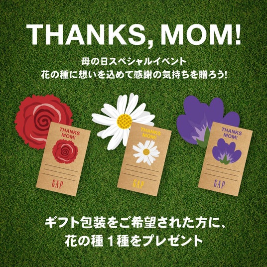 また全国のGapストアでは、4月26日(土)より「Mother’s Day イベント」を開催します。本イベントでは、期間中ご来店いただいたギフト包装を希望するお客様へメッセージカード付き花の種をプレゼント。花の種は、カーネーション、カモミール、ラベンダーの全3種のうち1種お選びいただけます。また、お母さんへ似顔絵とメッセージを書いてプレゼントできる台紙もご用意しております。