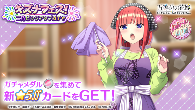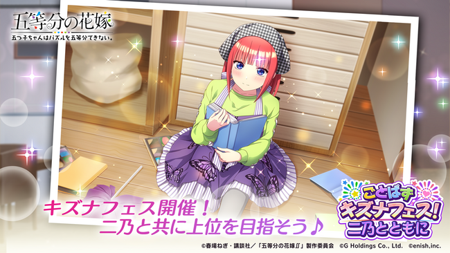 株式会社enish(本社:東京都港区、代表取締役社長:安徳 孝平、以下enish)は、2023年4月12日(水)より、アニメ「五等分の花嫁」初となるゲームアプリ『五等分の花嫁 五つ子ちゃんはパズルを五等分できない。』にて、「ごとぱずキズナフェス!・二乃とともに」を開催いたします。