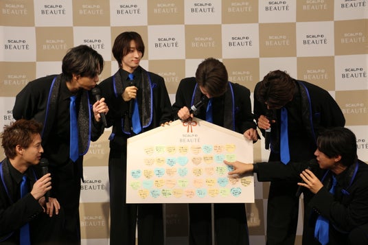 また、「ツヤ髪になって「今日可愛いね」と言ってもらいたい」という願掛けに対し、松岡さんが「髪綺麗だね、今日めっちゃ可愛いね」とさわやかな笑顔で、ファンも思わずニヤニヤしてしまうような決め台詞を披露!早速ファンからのお願い事を叶えてしまう、サービス精神旺盛なMATSURIの皆さんなのでした。そして、美髪の願掛けとしてメンバー全員で「スカルプD ボーテで美髪になって、みんなの願いが叶いますように!」と高らかに宣言しました。