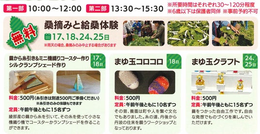 グンゼ株式会社の創業の地、京都府綾部市にあるグンゼ博物苑では、5月17日から、「さわって体験、養蚕の記憶」をテーマに、地元の精神・発達障害当事者団体である一般社団法人蚕都Grants協力のもと、「グンゼミニ浮世絵展」および「おかいこさんフェスティバル」を開催いたします。今回は体験を通じて、養蚕およびその歴史について学んでいただくため、関連する作品展示およびワークショップをご用意しました。蚕都綾部で養蚕の歴史体験をお楽しみください。