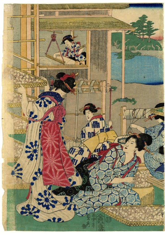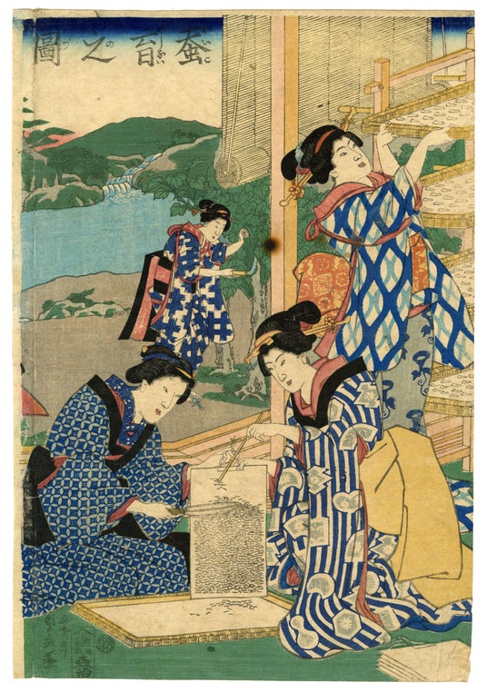 歌川貞秀「蚕育之図(かいこやしないのず)」3枚続 慶応3年