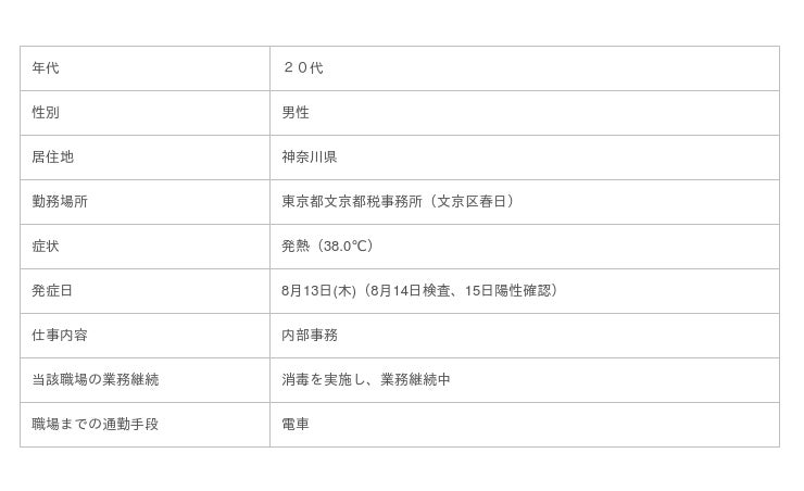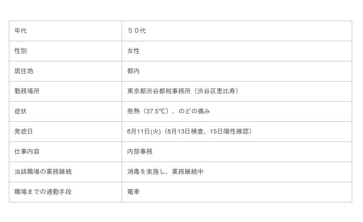 ・上記職員は、内部事務に従事しており、発症2日前である8月11日(火)以降において、業務上の都民との接触はありません。
