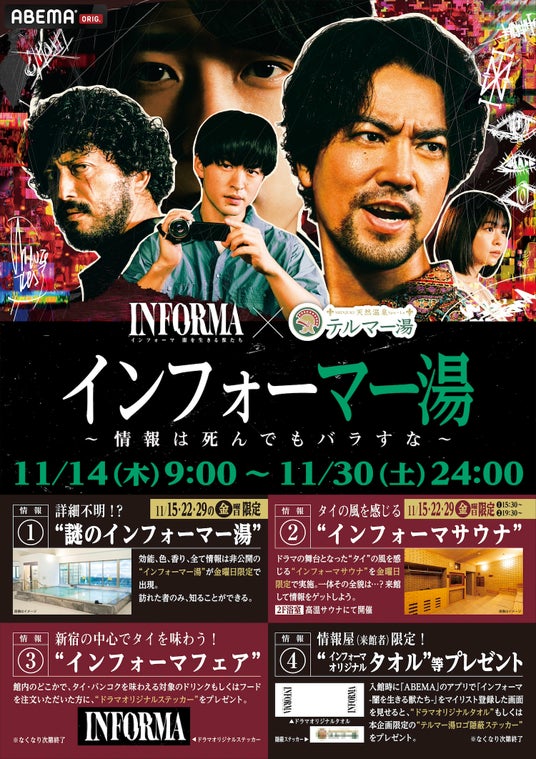 新しい未来のテレビ「ABEMA(アベマ)」は、毎週木曜日の夜11時よりオリジナルドラマ『インフォーマ -闇を生きる獣たち-』を放送しております。このたび2024年11月14日(木)朝9時より、『インフォーマ -闇を生きる獣たち-』と都内最大級の日帰り入浴施設、テルマー湯 新宿店が特別コラボ企画を開催することを決定いたしました。