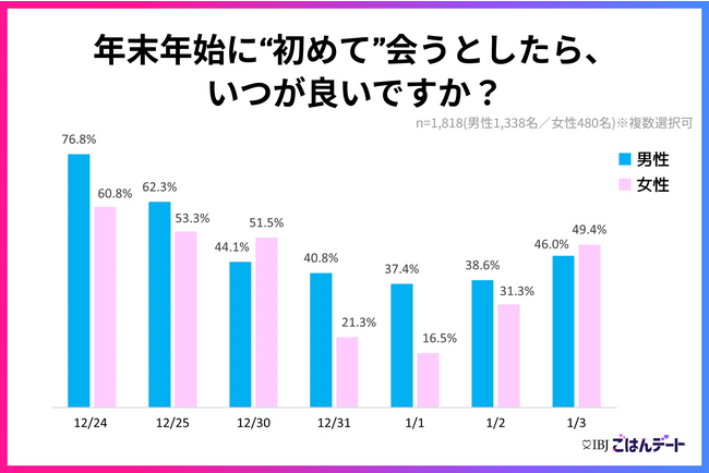 クリスマスや年末年始に“初めて”会うことに肯定的な方に対し、会うならいつが良いのか質問したところ、 男女ともに12/24(クリスマスイブ)が最多で、男性76.8%、女性60.8%という結果に。他にも、12/30までの期間においては、会うことに対し、ほぼ半数の人が良いと回答。この結果を踏まえると、年内の駆け込みでの出会いにも期待できるかもしれません。