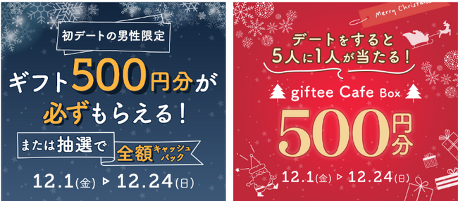 12/1~12/24の期間中にデートをした男女を対象に、クリスマスギフトをプレゼント。出会いのニーズが高まるこの機会にご利用ください♪