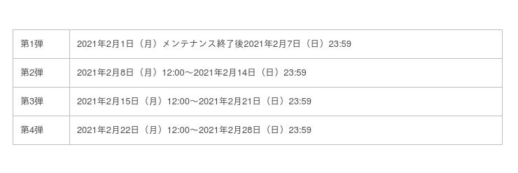 開催期間(前半):2021年2月1日(月)メンテナンス終了後 ~ 2021年2月15日(月)11:59