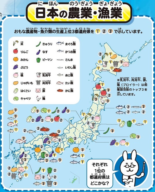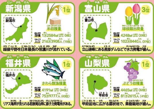 ◆都道府県データ・・・都道府県ごとのデータを地図欄外に見やすく配置|| 中学年用⇒都道府県を楽しく学べる仕掛けがいっぱい!生産量日本一、特産品など各都道府県にゆかりの情報を楽しく学べる