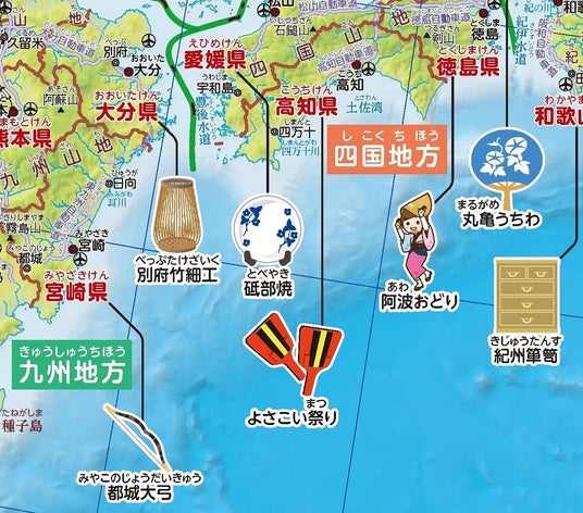 ◆各地の伝統的工芸品や祭のイラストを地図周辺に配置
