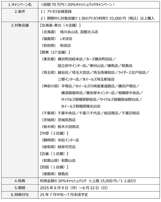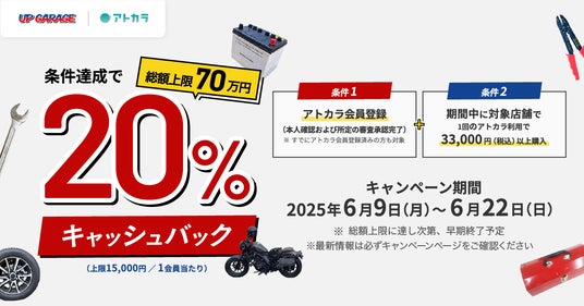カー&バイク用品のリユース専門店「アップガレージ」の35店舗にて「アトカラ」利用で条件を達成すると、もれなく20%キャッシュバックされるキャンペーンを期間限定で開催します。