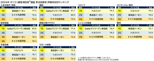 『英会話教室』項目別ランキング(2026年 オリコン顧客満足度(R)調査)