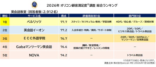 『英会話教室』総合ランキング(2026年 オリコン顧客満足度(R)調査)