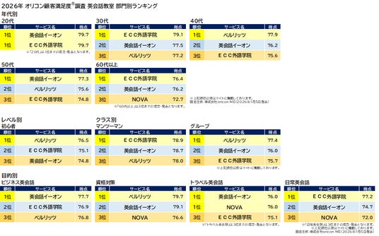 『英会話教室』部門別ランキング(2026年 オリコン顧客満足度(R)調査)