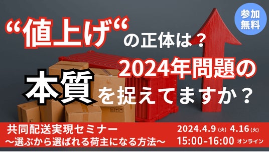 日本最大級のロジスティクス・物流コンサルティングファーム 船井総研ロジ株式会社(東京本社:東京都千代田区、代表:菅重宏、以下「船井総研ロジ」)は、2024年4月9日(火)15:00~16:00、荷主企業の経営者、経営幹部の方々を対象にした「第1回 共同配送実現セミナー」をオンラインで開催いたします。