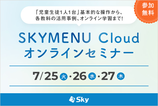 実際の授業を想定した活用シーンに合わせて「SKYMENU Cloud」の操作をご体験いただけるセミナーです。操作方法や活用場面などに関するご質問も承りますので、ぜひお気軽に「SKYMENU Cloud」をご体験ください。