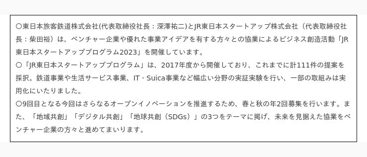 下記のとおり募集します。なお詳細についてはJR東日本スタートアッププログラム専用ホームページ(URL:https://jrestartup.co.jp/2023-entry-autumn/)をご参照ください。