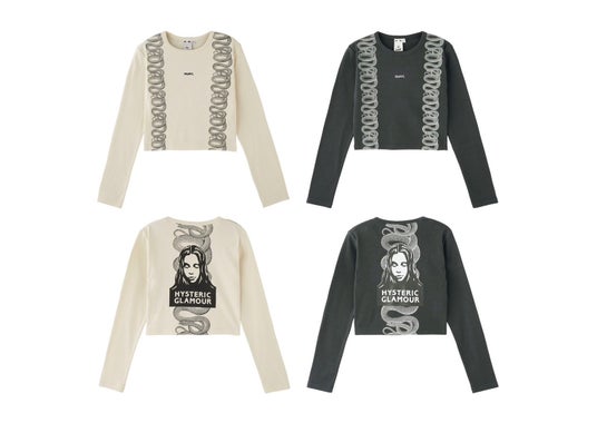 本コラボレーションはHYSTERIC GLAMOURの代表的なグラフィックである「SKULL BERRY」、「TYPEWRITER LOGO」、「SNAKE LOOP」を使用し、今期のムードにマッチするダークな印象に仕上げました。加えて過去のコラボレーションで好評だったX-girlの「FACE」とHYSTERIC GLAMOURロゴ、HYSTERIC GLAMOURの「VIXEN GIRL」とX-girlロゴを組み合わせたグラフィックを展開。2024年で30周年を迎えたX-girlと40周年を迎えたHYSTERIC GLAMOURの記念すべきコラボレーションです。