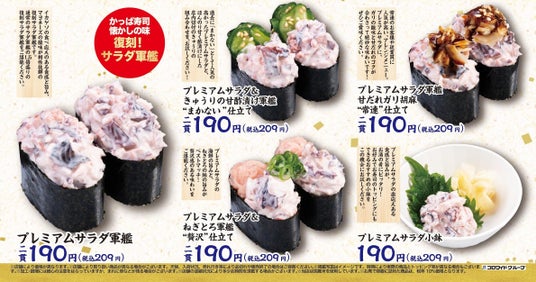 『プレミアムサラダ』は、ボイルイカの食べ応えある食感やマヨネーズのまろやかな酸味、あと引くイカの旨みなどが1980年代の味わいを思い起こさせます。また、かっぱ寿司の常連のお客様と長年かっぱ寿司で働く従業員が楽しむアレンジ、様々なネタと組み合わせて商品として提供されていた時代のものをアレンジするなどしてご用意いたしました。