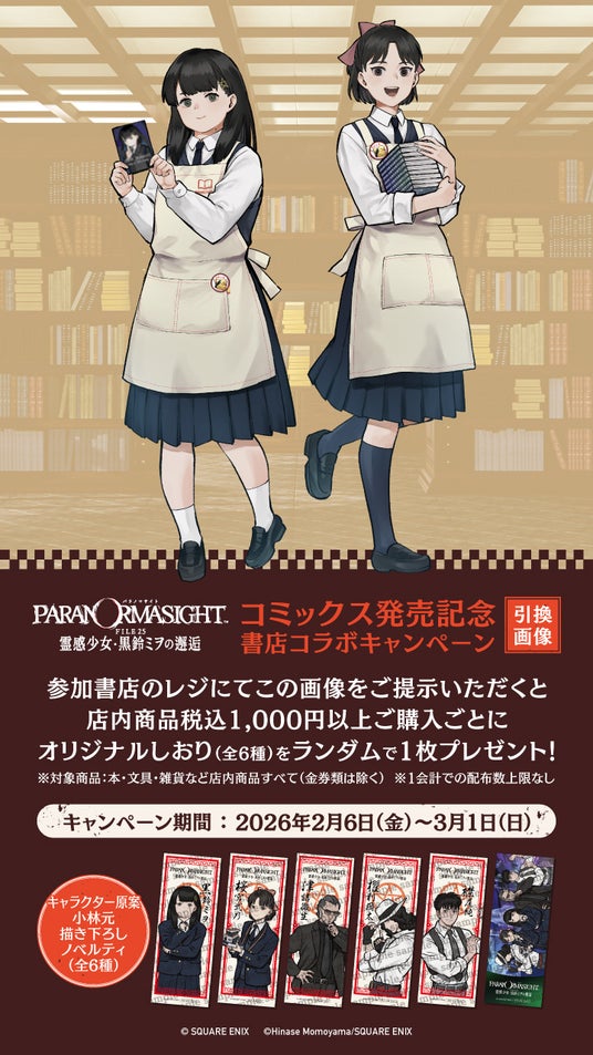 本キャンペーンでは、ゲームのキャラクター原案担当の小林元氏が描き下ろしたイラストを使用した、お札風のオリジナルしおり(全6種)を特典としてプレゼントします。また、コミックス作画担当の桃山ひなせ先生による書店員風キャラクター描き下ろしイラストを使用したコラボ限定オリジナルグッズの受注販売や、コミックス購入者限定のポストカードプレゼント、オリジナル図書カードが当たるXハッシュタグプレゼントキャンペーンなど、パラノマサイトファンのみなさまに楽しんでいただける企画をお届けします!